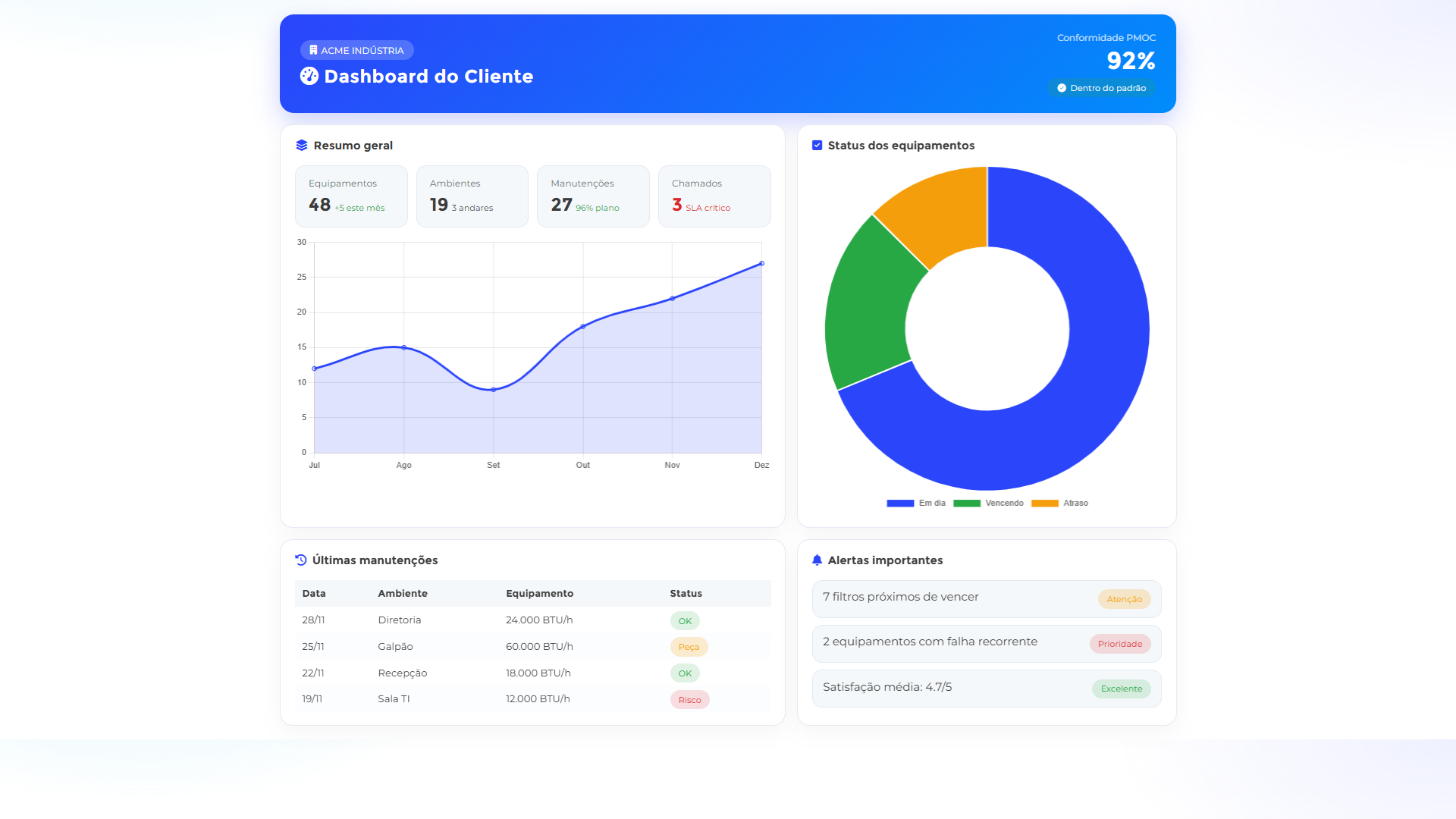 A MEU PMOC é uma ferramenta de gestão fantástica desenvolvida especialmente para lhe ajudar a acabar de vez a burocracia dos seus contratos de PMOC. A ferramenta é totalmente intuitiva, com alguns cliques você consegue fazer a emissão do seu PMOC, programa as manutenções. Além da facilidade na emissão do documento, ele fica salvo na nuvem, sem papelada, seu cliente e você acessam em tempo real apenas apontando a câmera do celular no QR Code com sua logomarca, com tela de boas-vindas personalizada, gerado na plataforma mesmo, facilmente com alguns cliques. E tem mais! Seu cliente consegue abrir um chamado de manutenção para o equipamento apenas apontando a câmera do celular para o QR Code e você recebe no seu WhatsApp. A MEU PMOC é uma ferramenta indispensável para quem trabalha com manutenção periódica e quer uma gestão prática, eficiente e exclusiva!